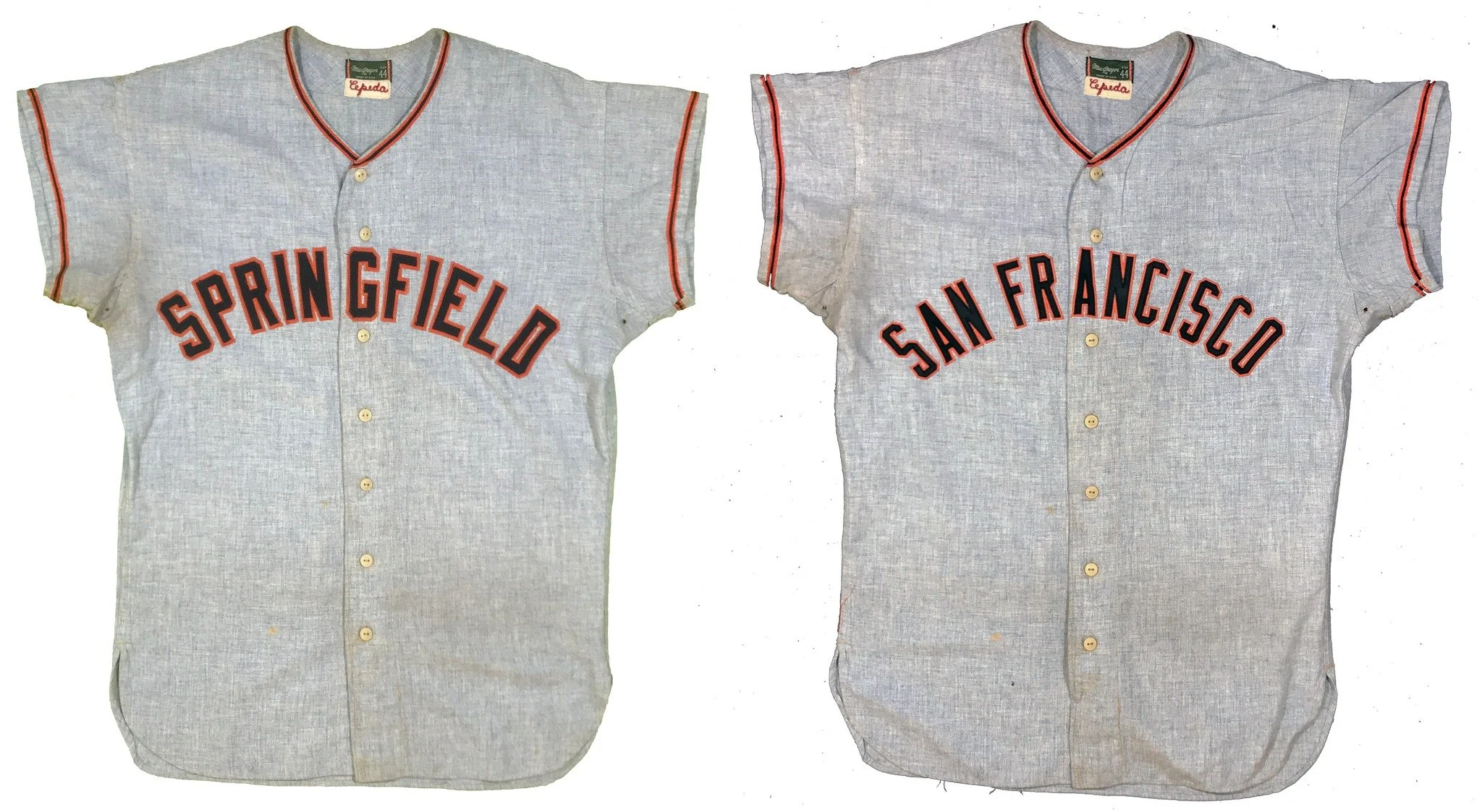 This game worn gray flannel McGregor jersey came my way from collector Mark H. While it still had Cepeda’s retired number 30 on back, the front had been converted to say “Springfield” as it was unceremoniously sent to the minor leagues along all the other team uniforms, typical practice in the early 1960s. The light table confirms that the 30 on the back is original, but that the front crest was a replacement.
